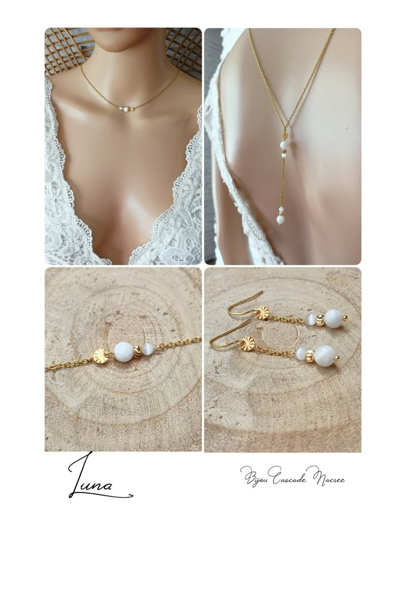 Avec son style Bohème et énergisant cette parure saura vous séduire. Elle sublimera avec élégance un profond décolleté de dos ainsi que votre poignet tout en délicatesse et sans oublier cette jolie petite Paire de boucles d’oreilles associées.