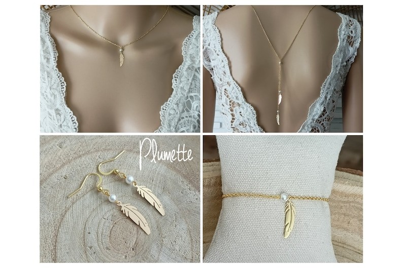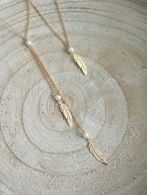 Parure conçue avec une fine chaîne classique en acier et perles de verre nacrées et quelques plumes en acier inoxydable or