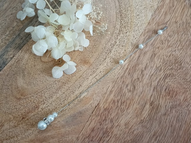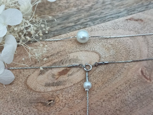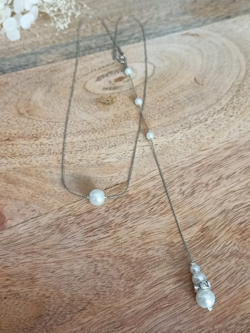 Ce collier est fait à partir d'une fine chaine Serpentine argenté de qualité agrémentée d'une subtile perle sur le devant du collier tout en simplicité et sa jolie cascade de dos entièrement amovible ornée de perles nacrées blanches de plusieurs tailles différentes et d'une rondelle de strass.
