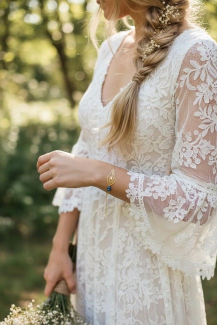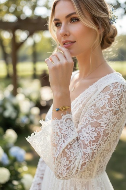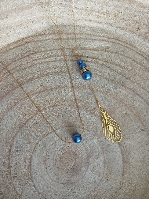Esprit Bohème chic et contemporain ce collier saura vous séduire.Il sublimera avec élégance un profond décolleté de dos et son beau bracelet assorti. Confectionné à partir d'une belle chaine dorée en acier inoxydable, agrémentée de perles nacrées bleues roi et d’un filigrane en forme de plume de paon finition dorée en acier inoxydable.