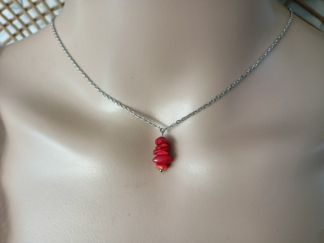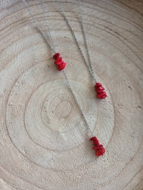 Ce collier est fait à partir d'une fine chaîne acier inoxydable argenté, agrémentée de plusieurs pépites de " Corail rouge " sur le devant du collier tout en simplicité et sa jolie cascade de dos. Bijou artisanal et original, totalement Unique.