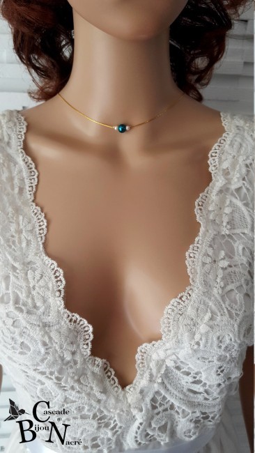 Ce collier est fait à partir d'une fine chaine serpentine en acier inoxydable argentée, agrémentée d'une subtile perle nacrée sur le devant du collier tout en simplicité et sa jolie cascade de dos ornée de perles nacrées dans des tons bleu canard, bleu paon et blanc.