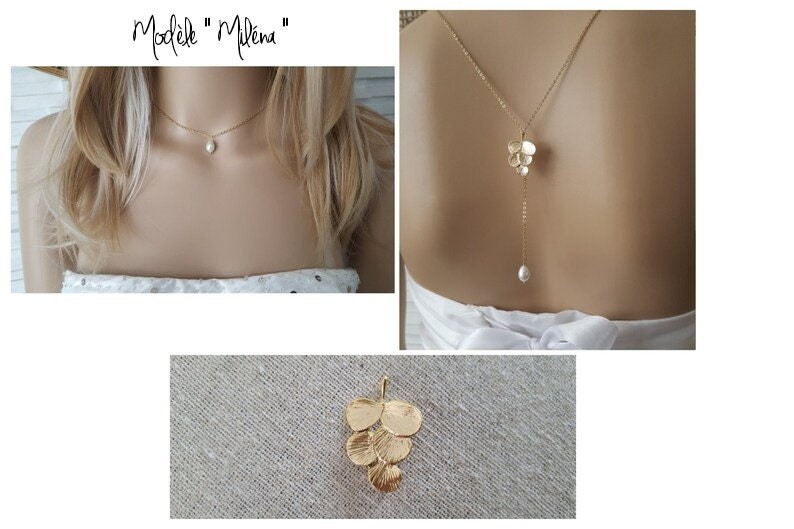 Ce collier est fait à partir d'une fine chaine, agrémentée d'une subtile goutte nacrée sur le devant du collier tout en simplicité et sa jolie cascade de dos ornée de feuillage et d une goutte nacrée blanche.