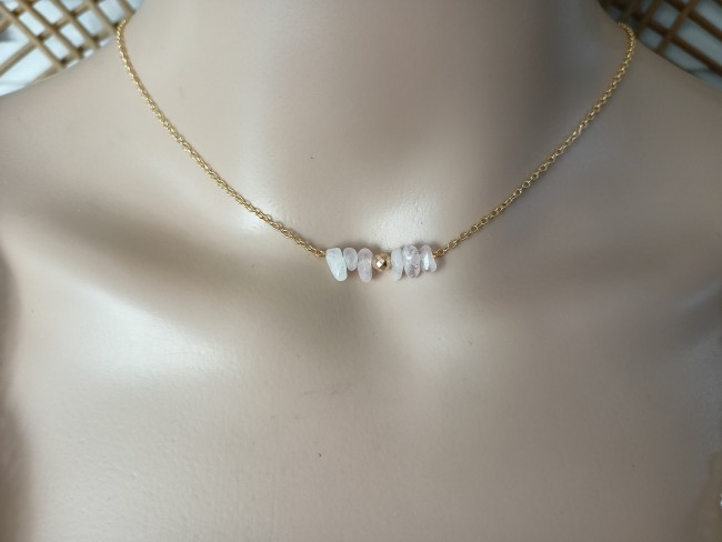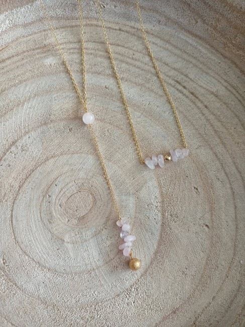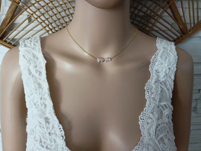 Ce collier est fait à partir d'une fine chaîne en acier inoxydable, agrémentée de plusieurs pépites de " Quartz rose " hématite doré sur le devant du collier tout en simplicité et sa jolie cascade de dos finition pendentif breloque boule martelée en acier inoxydable doré. Bijou artisanal et original . Totalement Unique.