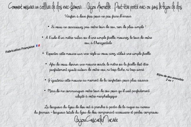 Merci de me communiquer votre tour de tête ainsi que la longueur souhaitée du bijou de dos.