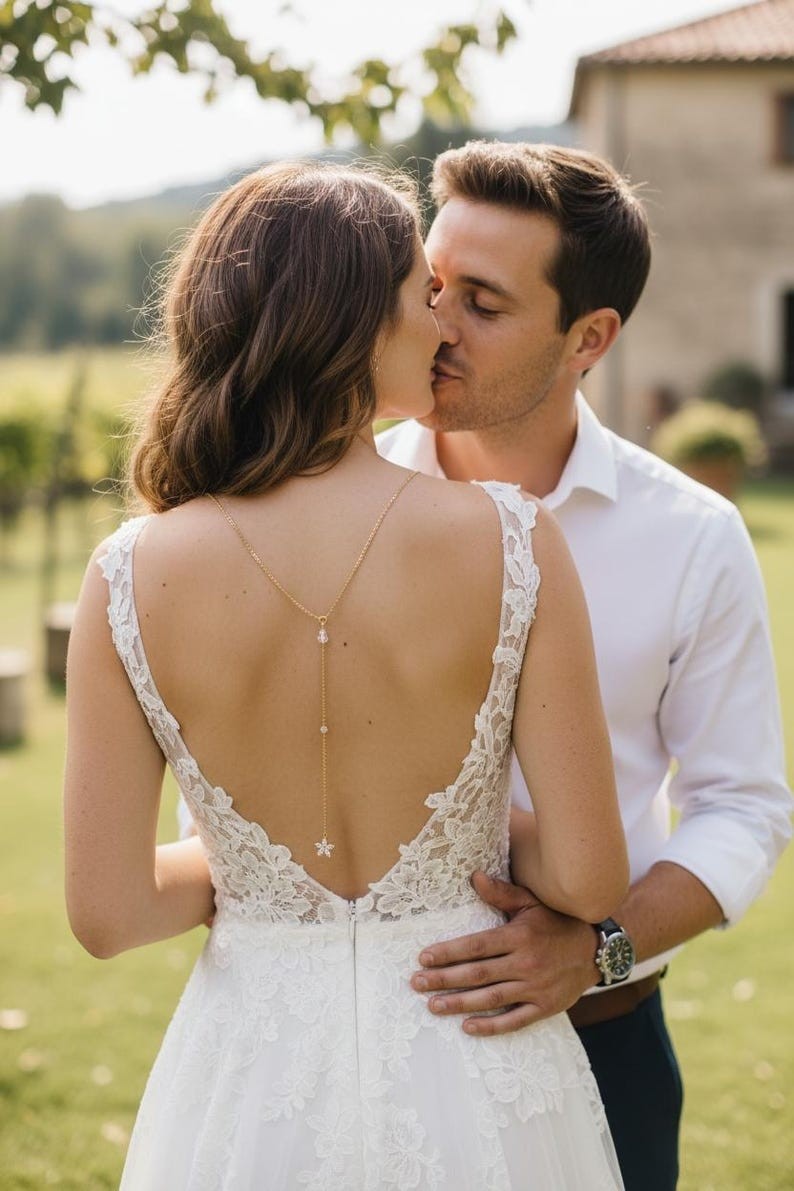 Vous pouvez choisir votre tour de cou sur mesure ainsi que la longueur du bijou de dos amovible. La longueur de ce bijou de dos est à prendre à partir de la nuque .