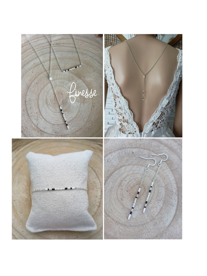 Avec son style Bohème et romantique cette parure saura vous séduire. Elle sublimera avec élégance un profond décolleté de dos ainsi que votre poignet tout en délicatesse et sans oublier cette jolie petite Paire de boucles d’oreilles associées.
