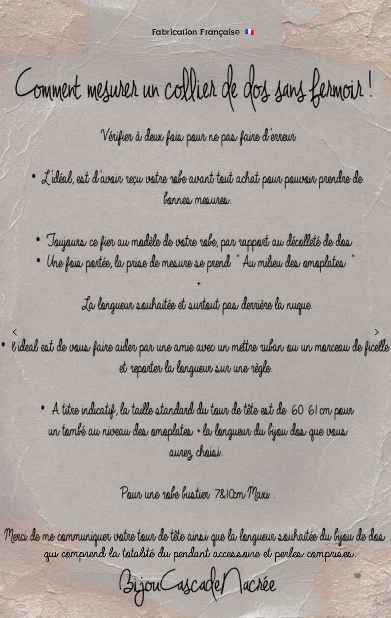 Merci de me communiquer votre tour de tête ainsi que la longueur souhaitée du bijou de dos.