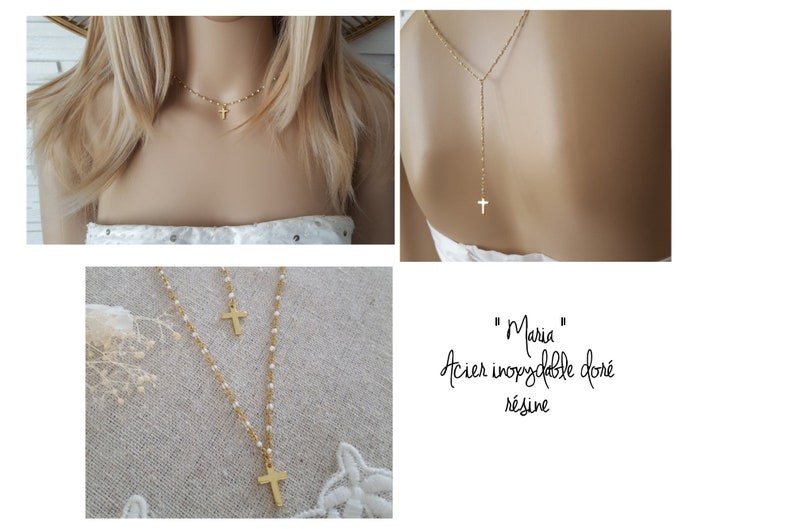 Plein de charme et d'élégance, ce collier de dos possède un design intemporel et religieux dans l'air du temps . Cette fine chaine en acier inoxydable maille forçat est orné de minuscules perles émaillées blanches et deux 2 pendentifs également en acier. Dans la même collection je vous propose aussi les boucles d'oreilles et bracelet assortis.