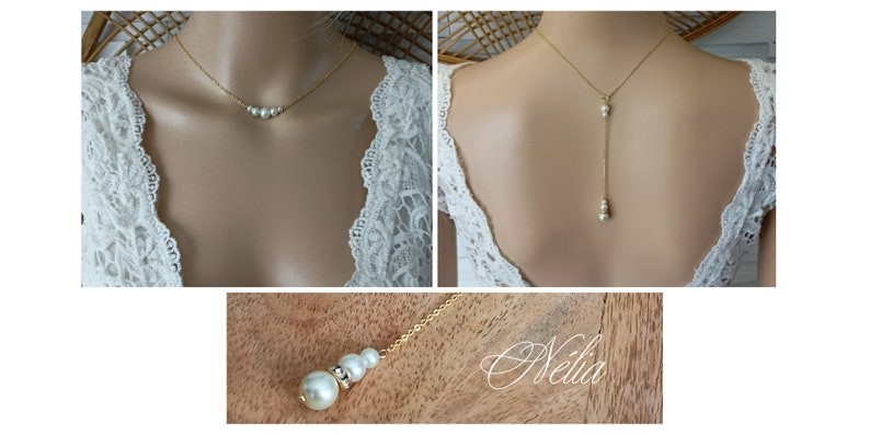 Ce collier est fait à partir d'une fine chaine classique en acier inoxydable oŕ, agrémentée de plusieurs perles nacrées blanches sur le devant du collier tout en simplicité et sa jolie cascade de dos entièrement amovible ornée des mêmes éléments au dos du collier.
