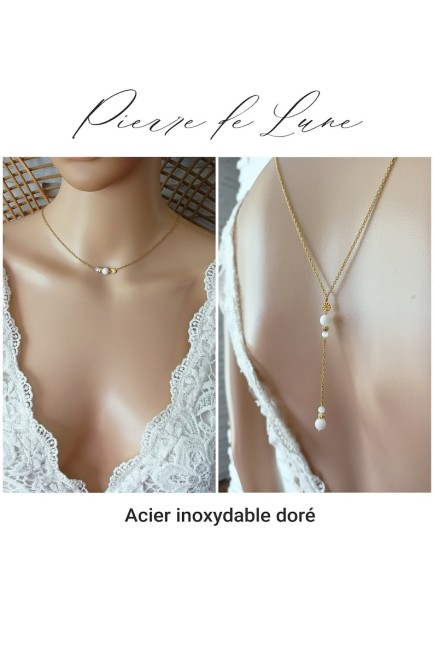 Ce collier de dos a été pensé et créé à partir d'une fine chaine classique doréeen acierinoxydable, agrémentée de plusieurs minuscules et délicates perles de miyuki dans des tons or et blanc orné d’une petite pierre naturelle de 4 mm " Pierre de lune" et d’un petit pendentif ciselé doré en acier inoxydable.