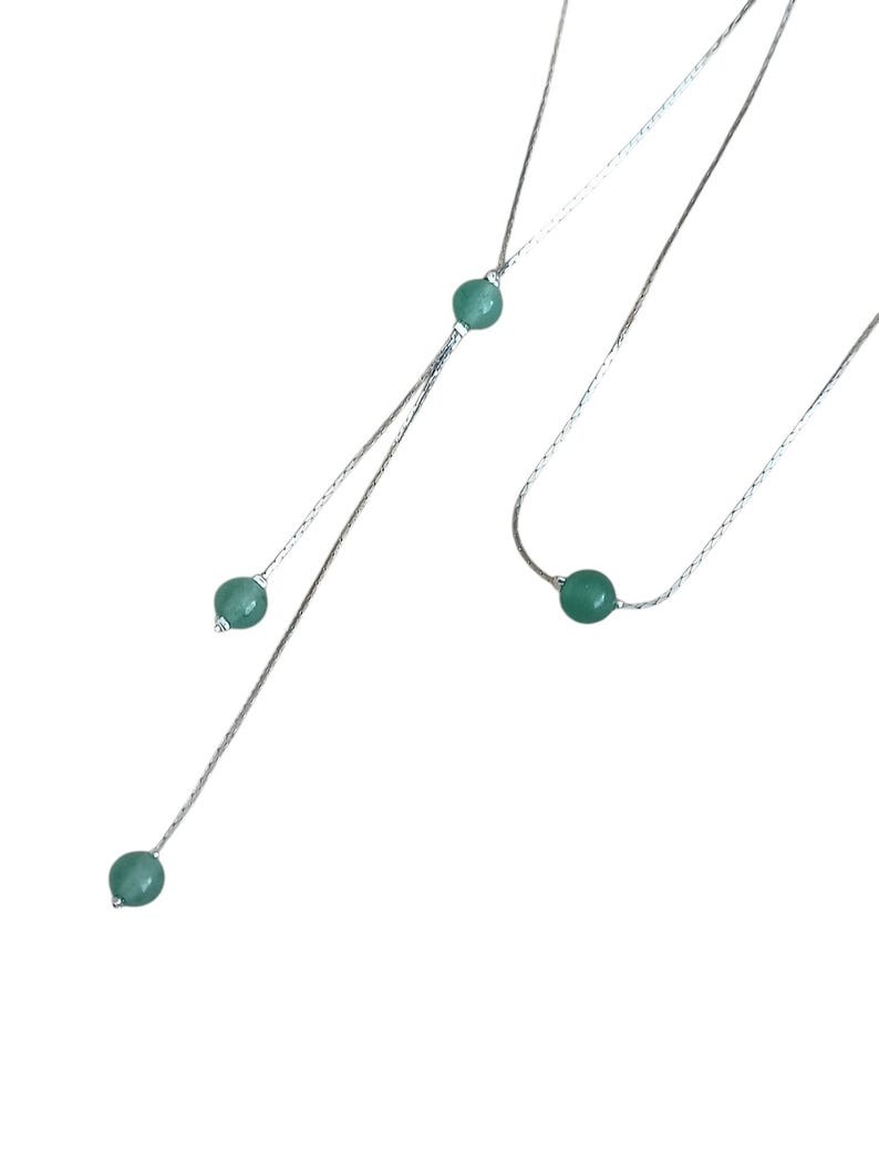 Plein de charme et d'élégance, ce collier de dos possède vertus et bien être avec un design dans l'air du temps . Cette fine chaine en acier inoxydable est ornée d'une subtile pierre AVENTURINE sur le devant du collier et d une cascade de Pierres naturelles AVENTURINE au dos du collier.