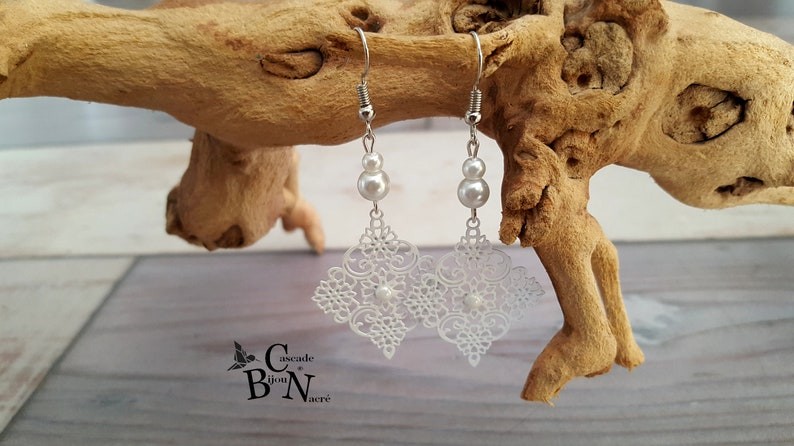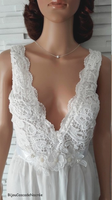 Fait à partir d'une belle chaine argenté de bonne qualité, agrémenté d'une subtile perles nacrée sur le devant du collier tout en simplicité et sa jolie cascade de dos avec perles nacrées cristal,filigrane en forme de " losange baroque arabesque " finition laqué blanc en acier inoxydable à son centre une jolie perle nacrée.
