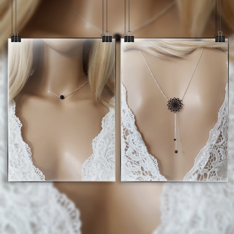 collier de dos pour mariée 2 en 1 dans des tons noir et blanc