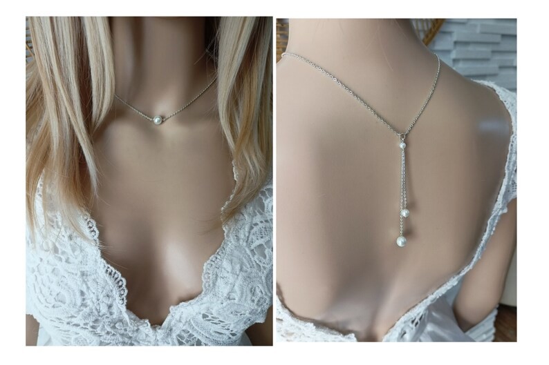 Ce collier est fait à partir d'une fine chaine acier inoxydable agrémentée d'une subtile perle sur le devant du collier tout en simplicité et sa jolie cascade de dos entièrement amovible ornée de perles nacrées blanche .