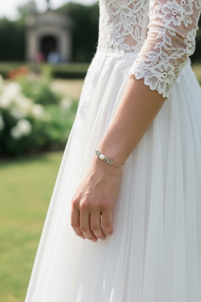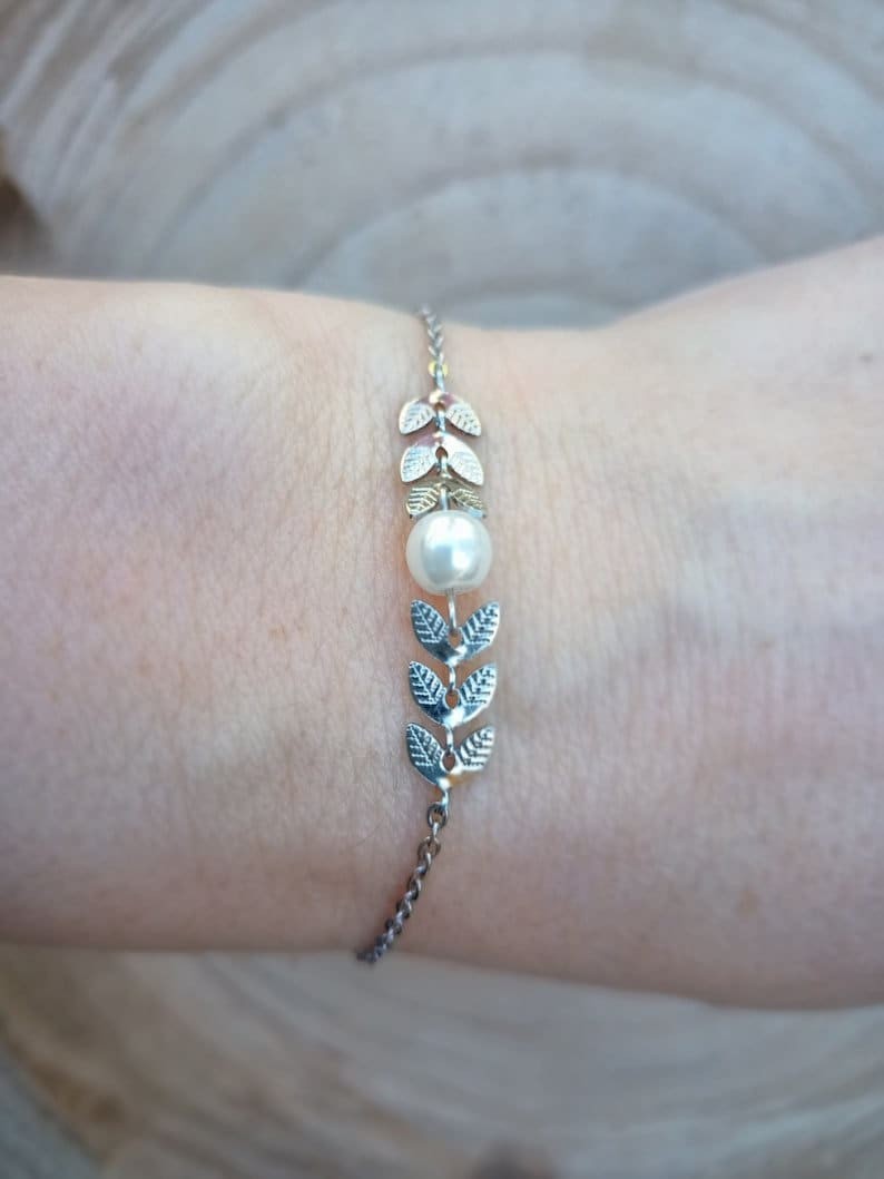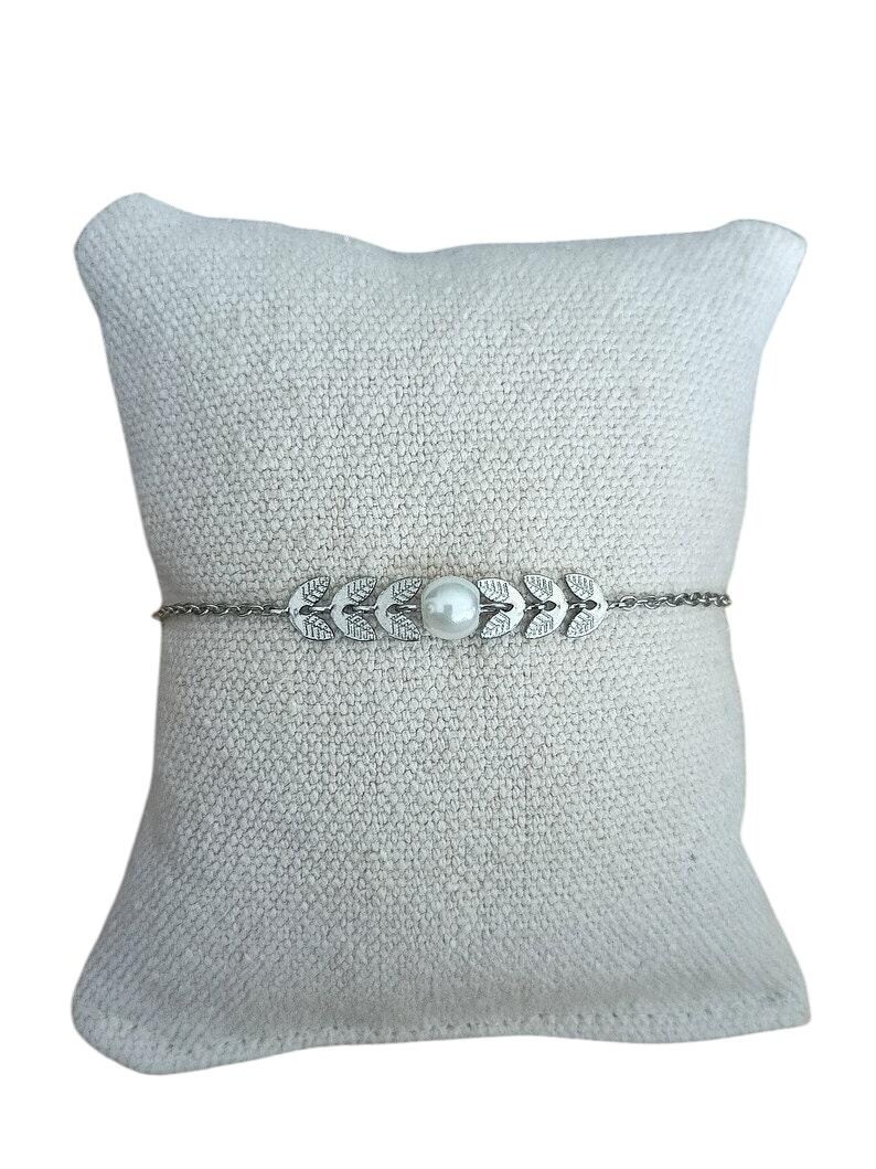 Ce bracelet est réalisé à partir d'une fine chaine classique en acier, agrémentée de plusieurs épis de blé finition perle nacrée blanche 6mm, finition argent en acier inoxydable qualité optimale.