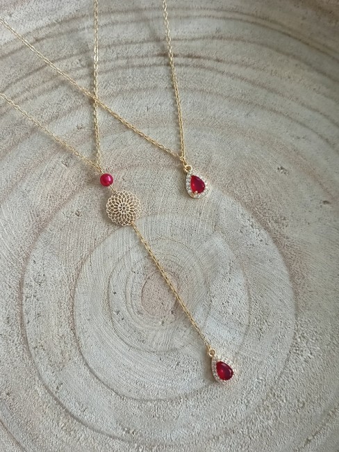 Ce filigrane en forme de mandala est orné d’une fine chaîne classique en acier inoxydable et de plusieurs petites perles nacrées rouge passion finition goutte de zirconium rouge et cristaux de swarovski compose ce bijou.