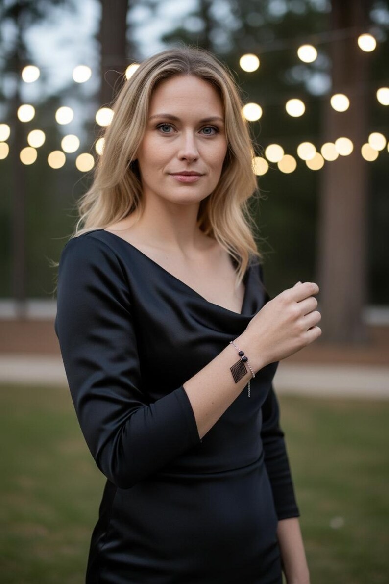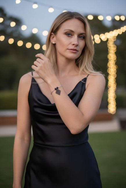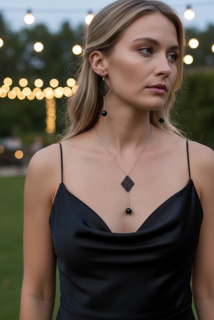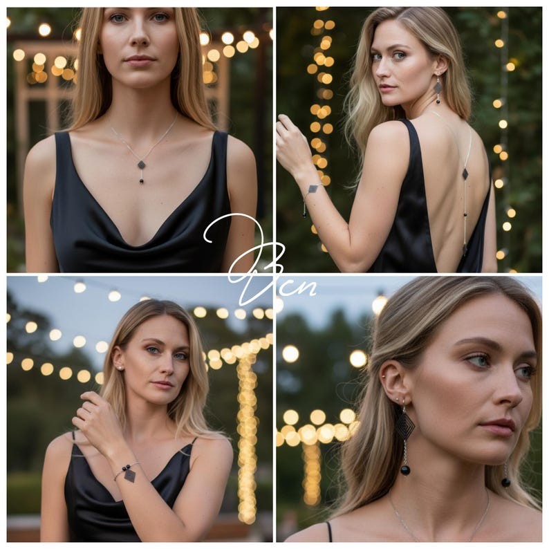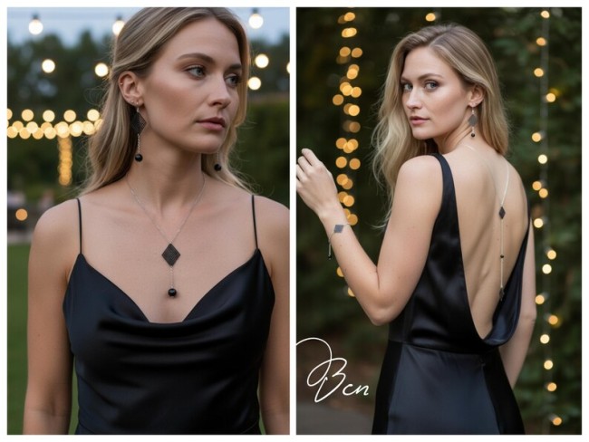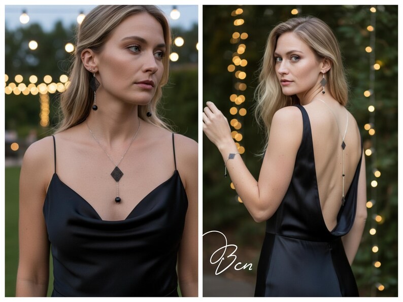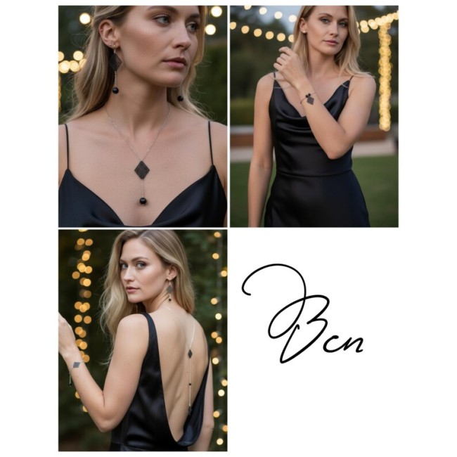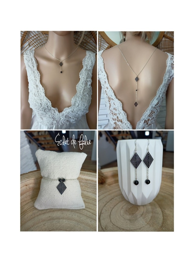 Avec son style géométrique et épuré cette parure saura vous séduire. Elle sublimera avec élégance un profond décolleté de dos ainsi que votre poignet tout en délicatesse et sans oublier cette jolie petite Paire de boucles d’oreilles associées.