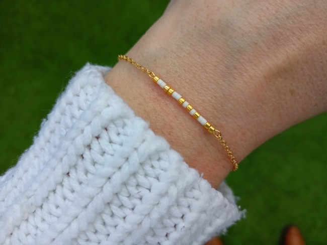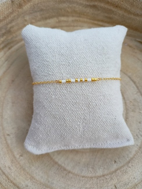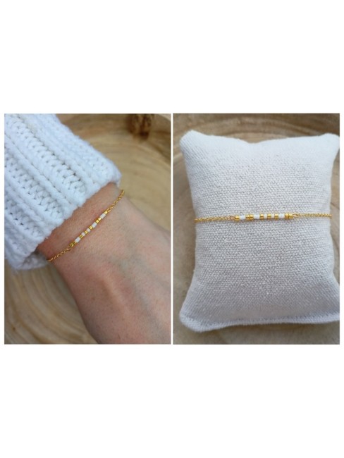 Ce bracelet a été pensé et créé à partir d'une fine chaine classique en acier inoxydable or , agrémentée de plusieurs minuscules et délicates perles de miyuki dans des tons or et blanc