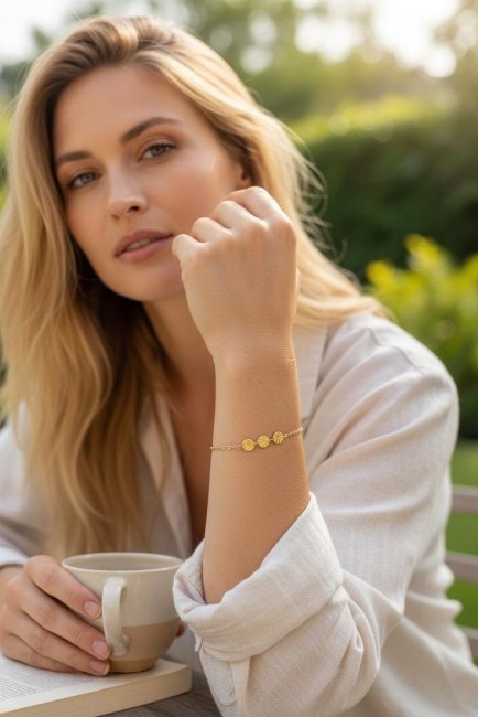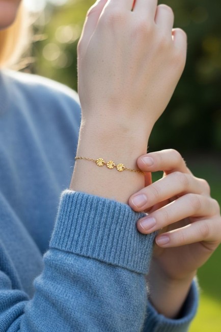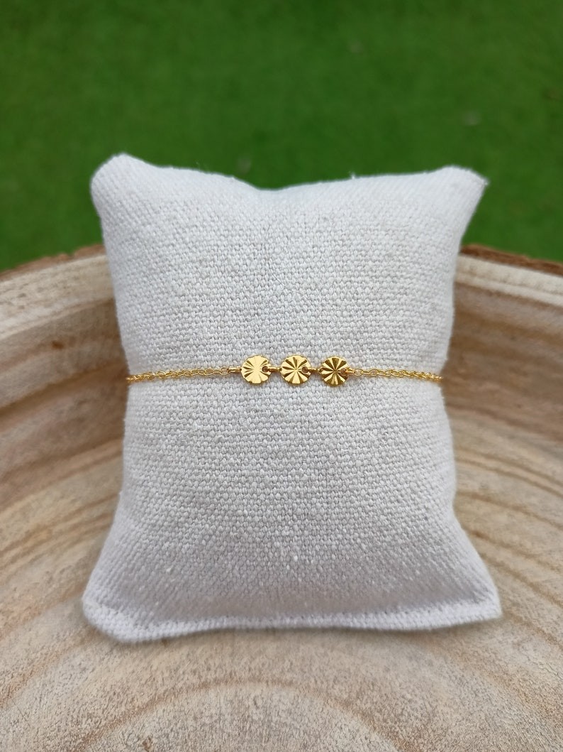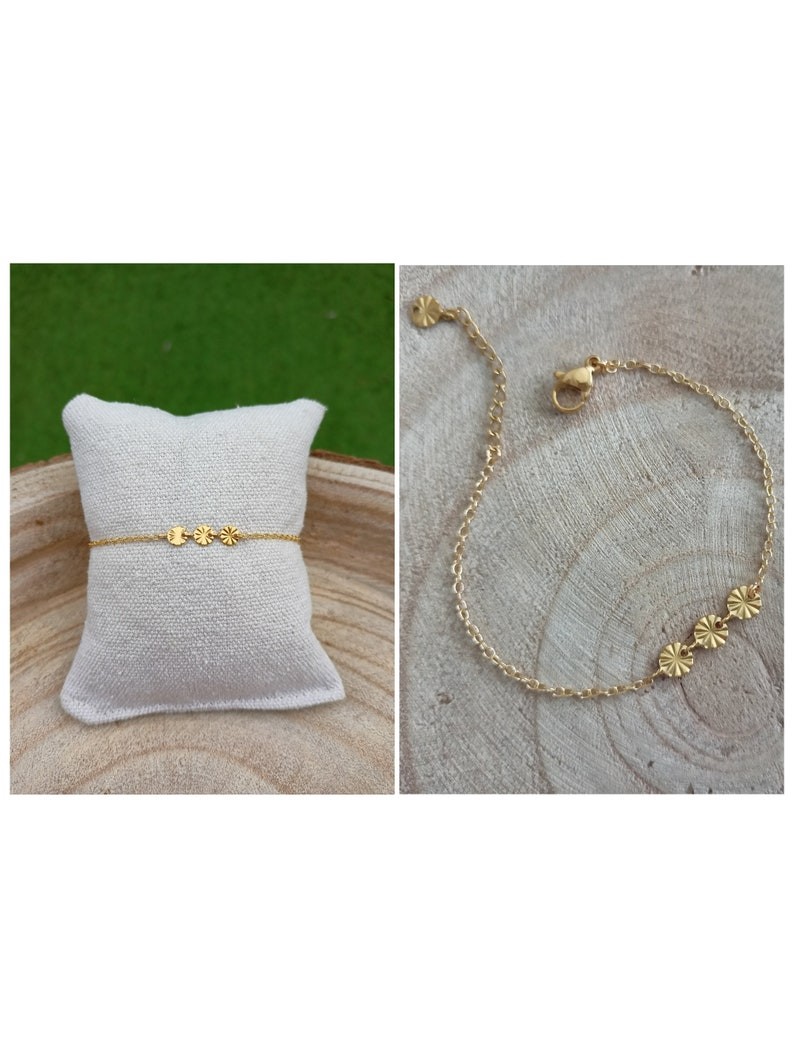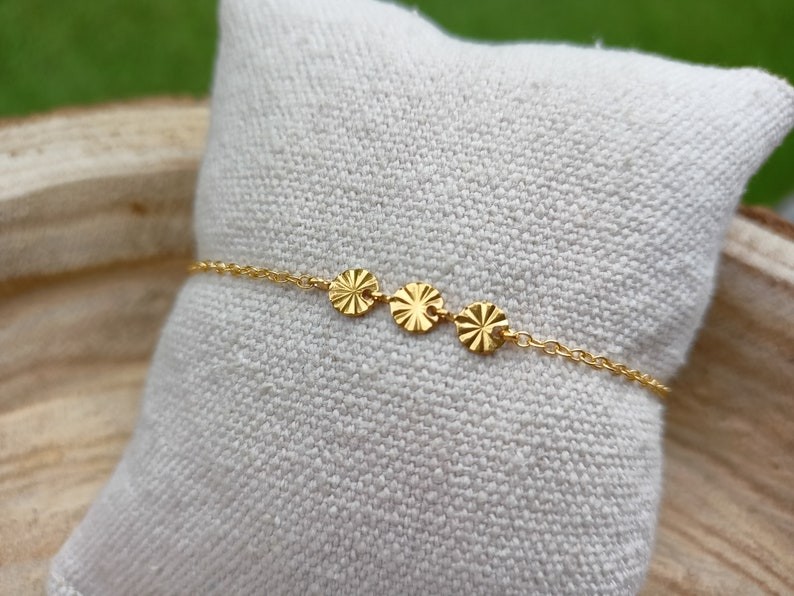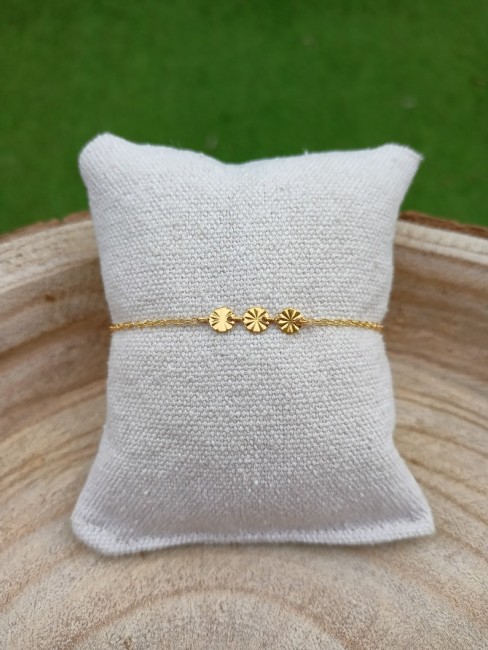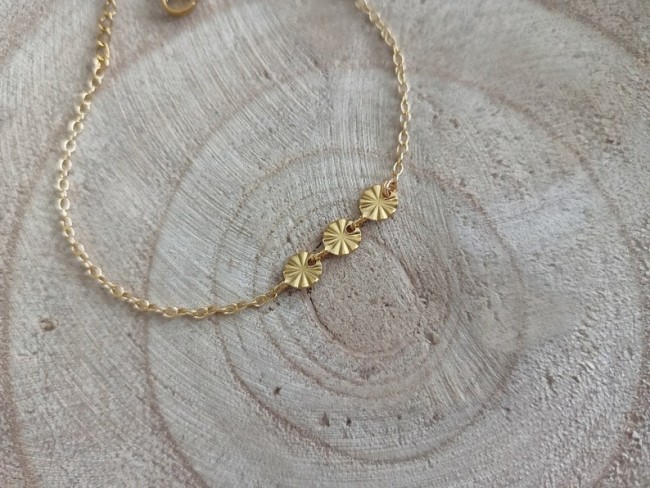 Ce bijou est réalisé à partir d'une fine chaine classique en acier ornée d’un trio de rond ciselé en acier inoxydable, qualité optimale pour tous les apprêts qui compose ce beau bracelet .