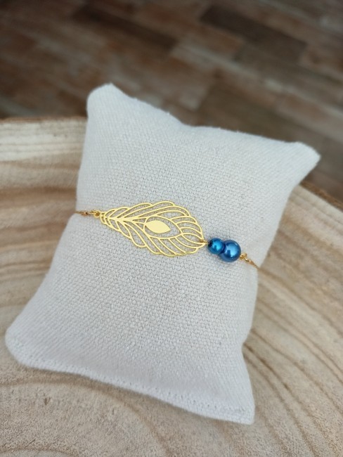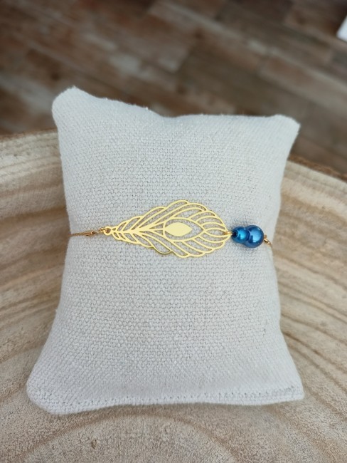 Joli Bracelet à l esprit bohème et minimaliste ce bijou est orné d'un filigrane en forme de plume de paon dorée en acier inoxydable