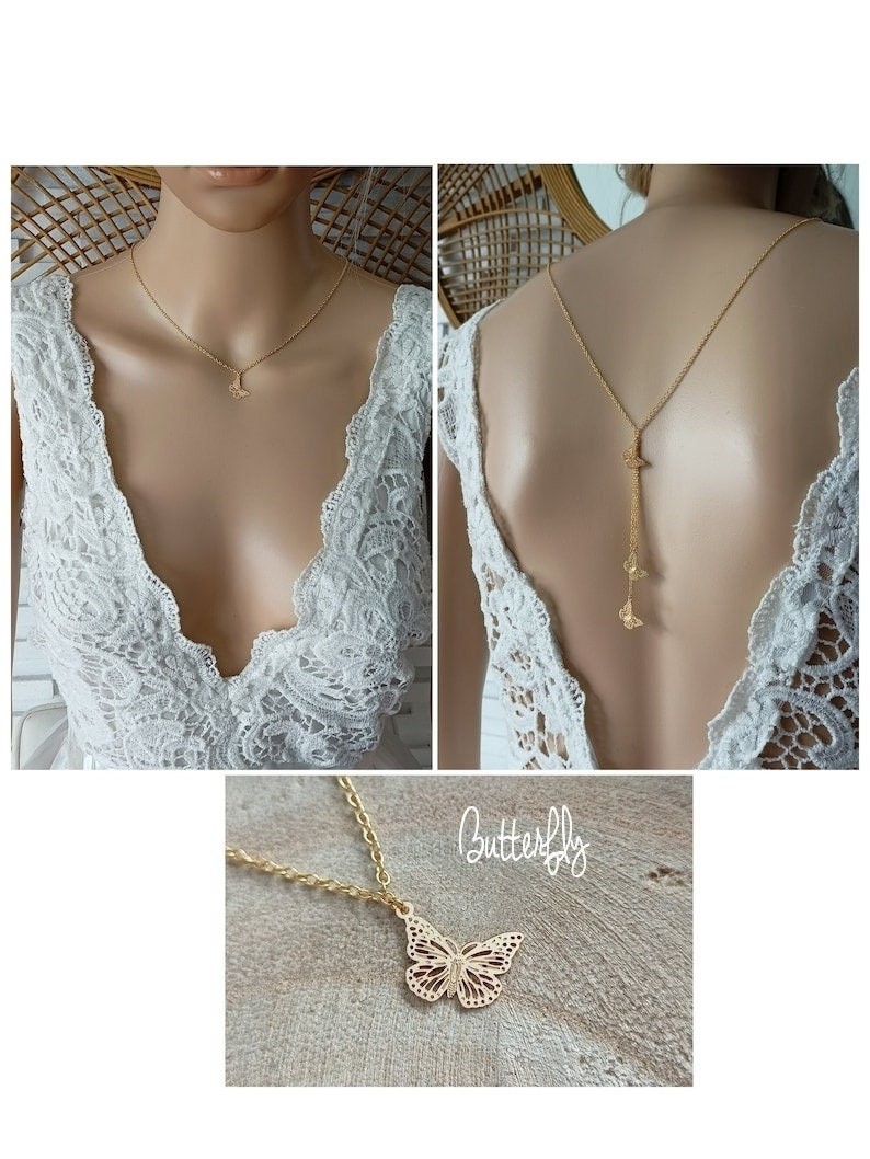 Esprit nature et épuré ce collier de dos a été pensé et créé à partir d'une fine chaine en acier inoxydable, agrémentée de plusieurs filigranes papillons ajourées en acier inoxydable or .