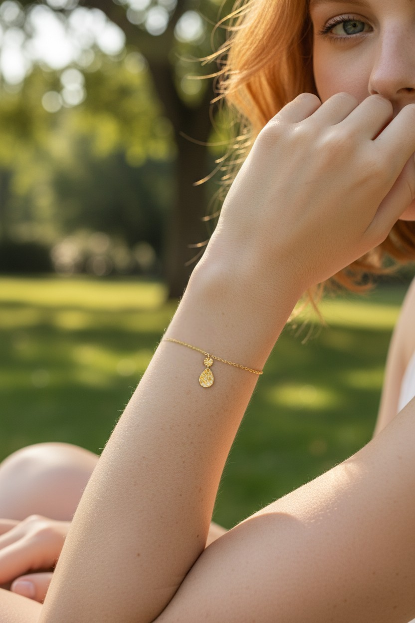 Ce bijou est réalisé à partir d'une fine chaine classique en acier ornée d’une goutte martelée et d’un petit pendentif rond en acier inoxydable, qualité optimale pour tous les apprêts qui compose ce beau bracelet .