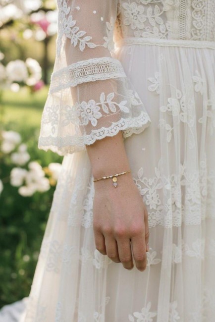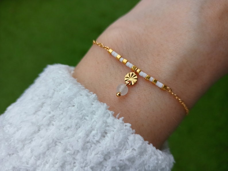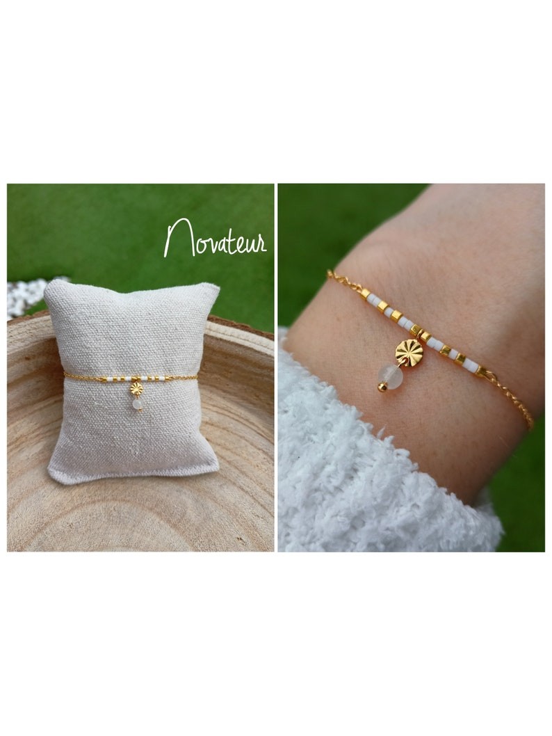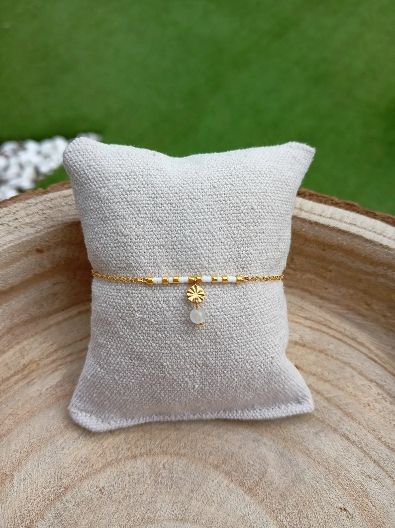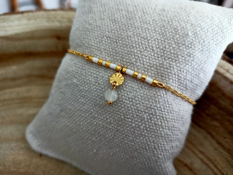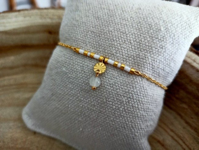 Ce bracelet a été pensé et créé à partir d'une fine chaine classique dorée, agrémentée de plusieurs minuscules et délicates perles de miyuki dans des tons or et blanc orné d’une petite pierre naturelle de 4 mm " Pierre de lune" et d’un petit pendentif ciselé doré en acier inoxydable.