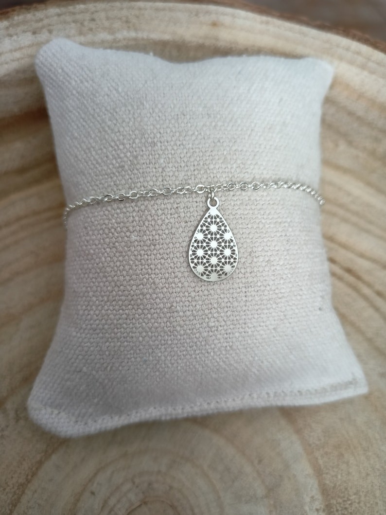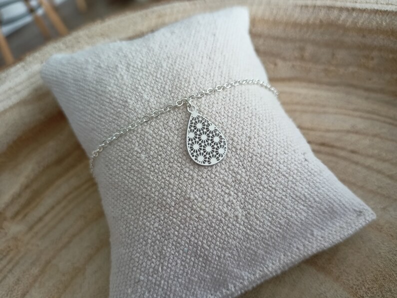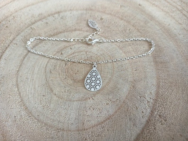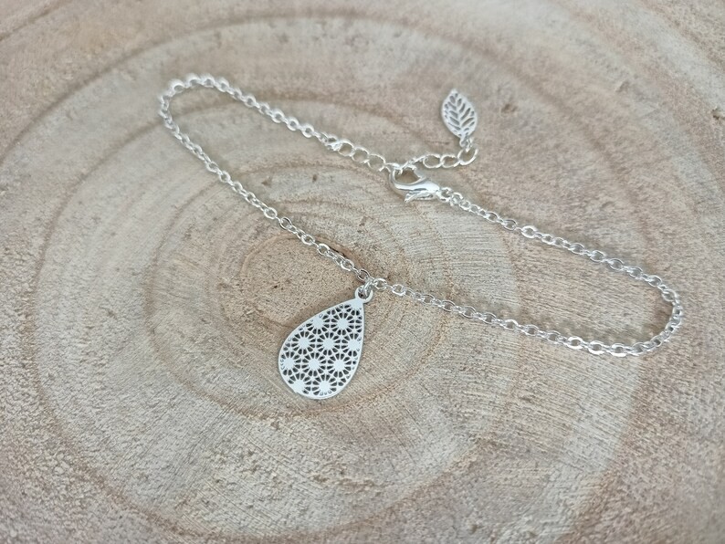 Son style minimaliste et sa délicate goutte ajourée fera de ce bracelet l'un de vos accessoires favoris . Cette fine chaine classique en acier argentée de qualité optimale est ornée d'un filigrane original en acier inoxydable