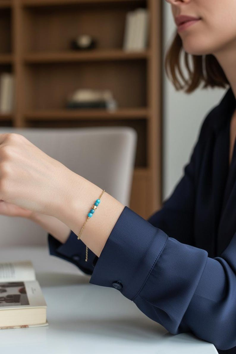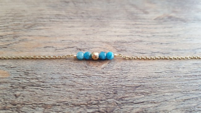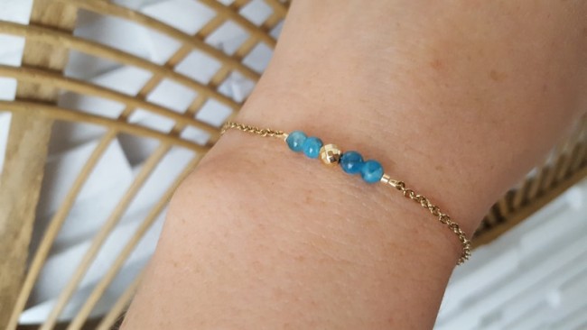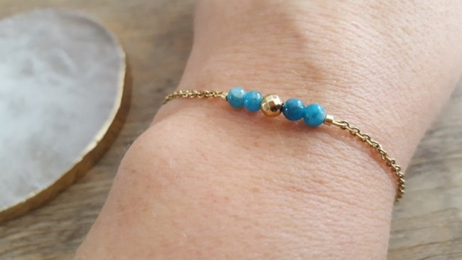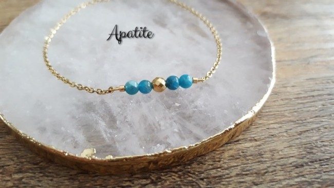 Ce bracelet est fait à partir d'une fine chaine classique perlées agrémentée de minuscules pierres naturelles " Apatite "