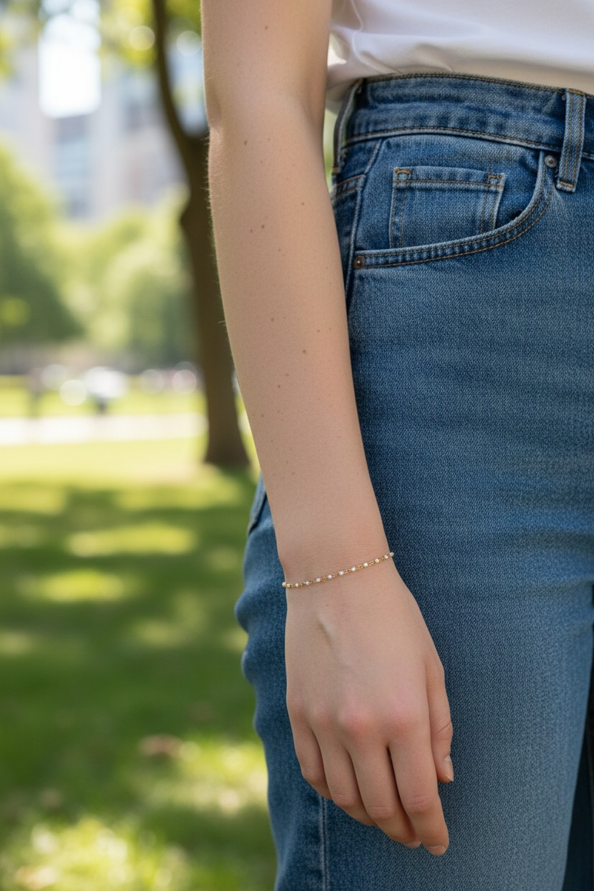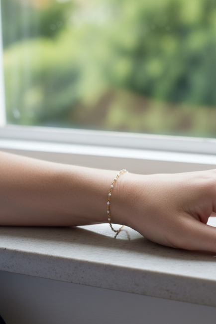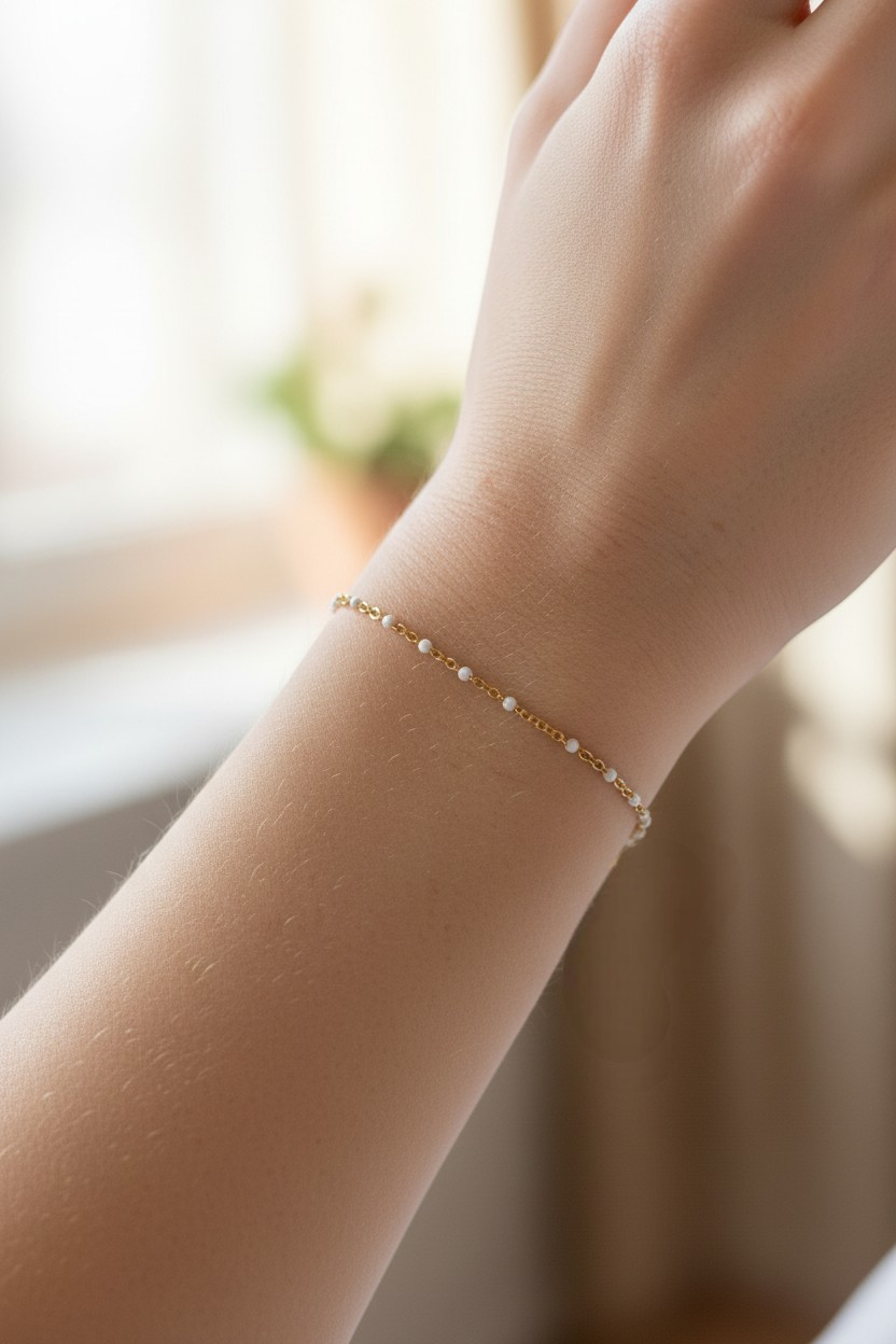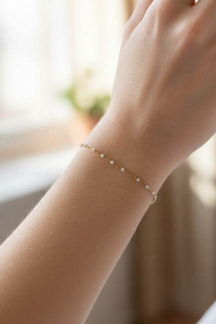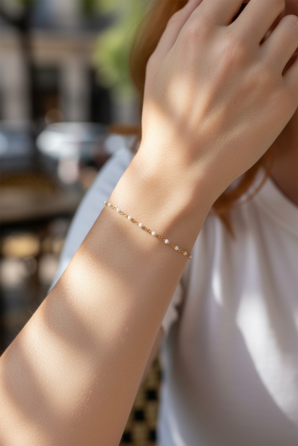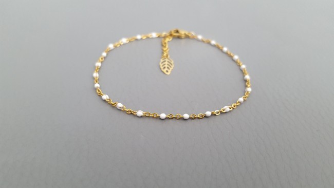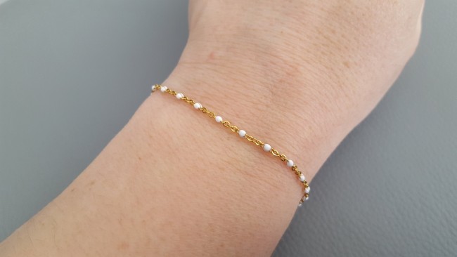 Coup de cœur pour ce joli bracelet constitué d une fine chaîne classique en acier inoxydable doré, ornée de minuscules perles émaillées blanches.