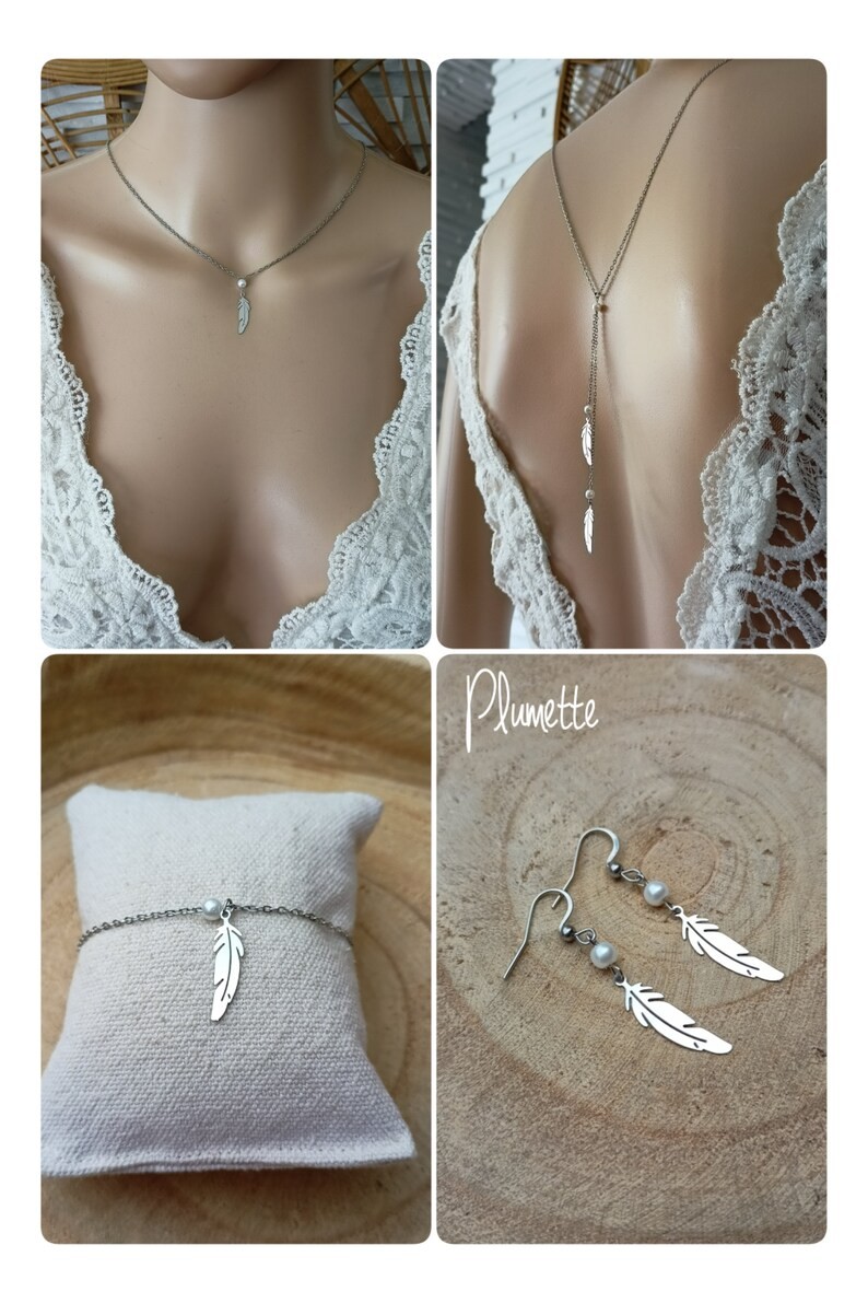 Parure conçue avec une fine chaîne classique en acier et perles de verre nacrées et quelques plumes en acier inoxydable.