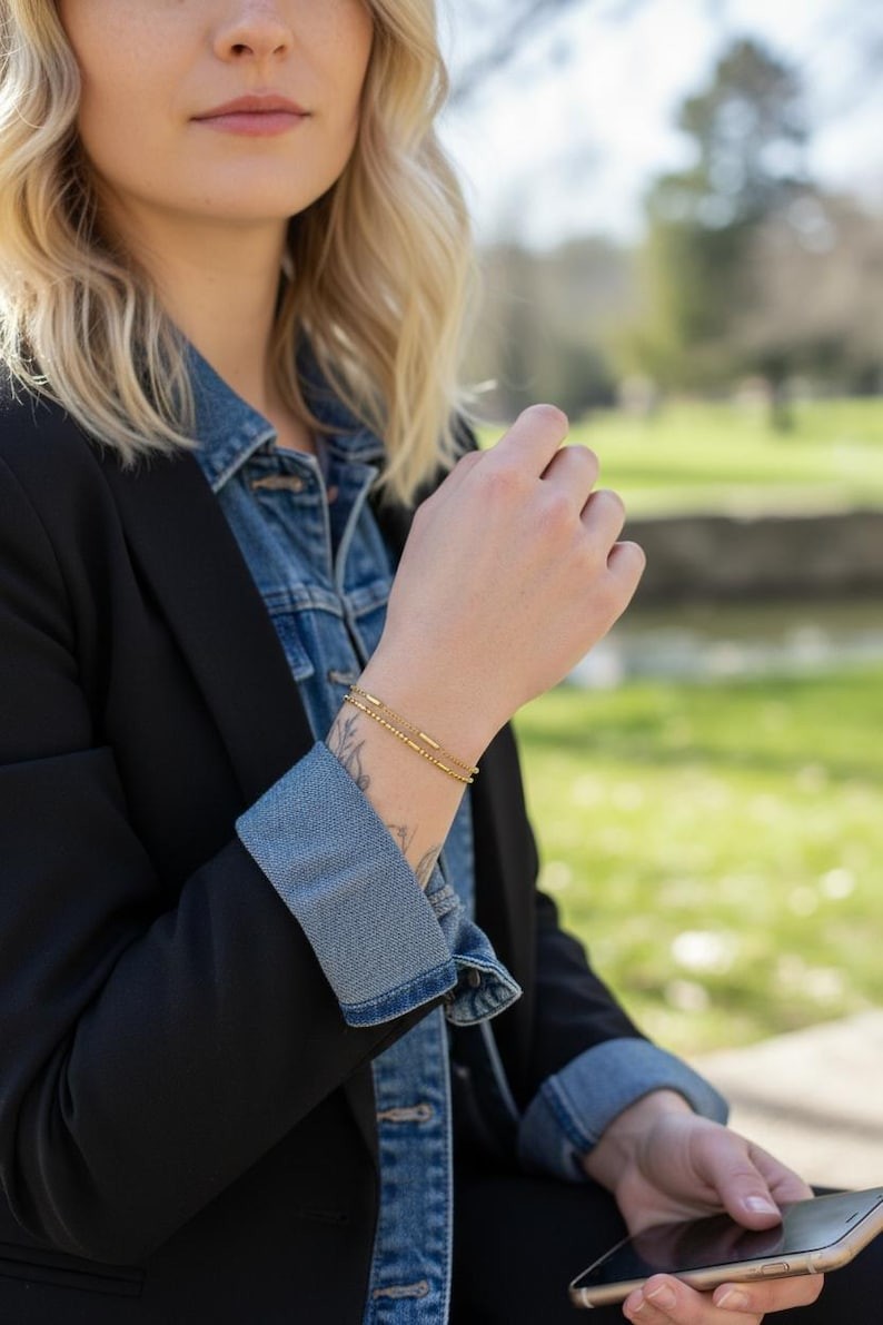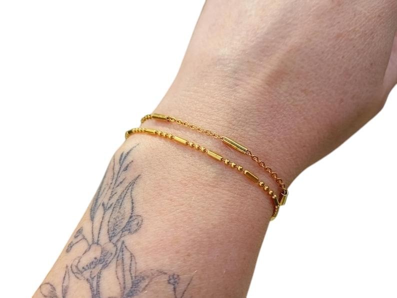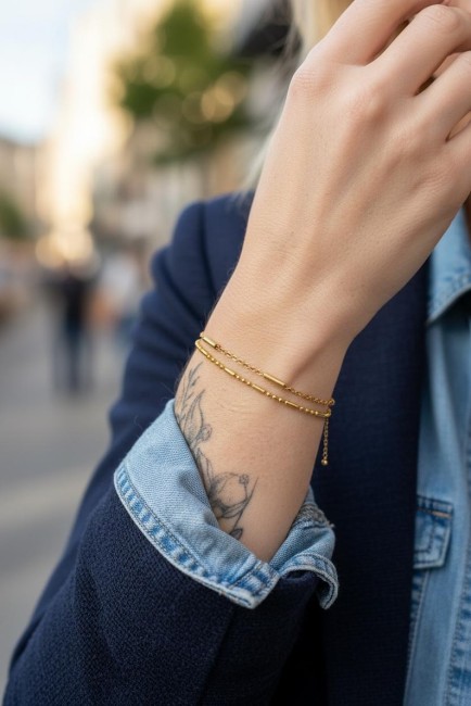Voici un joli duo de bracelets confectionné de 2 fines chaînes tendances dorées.