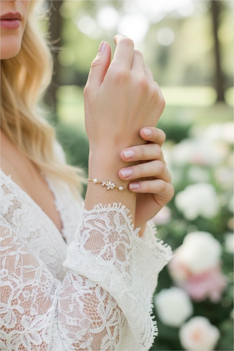 Ce bracelet est constitué d'une fine chaîne en acier inoxydable classique ornée de perles nacrées blanches ou ivoires et d un pendentif floral et feuilles en son centre serti de cristaux, diamants.