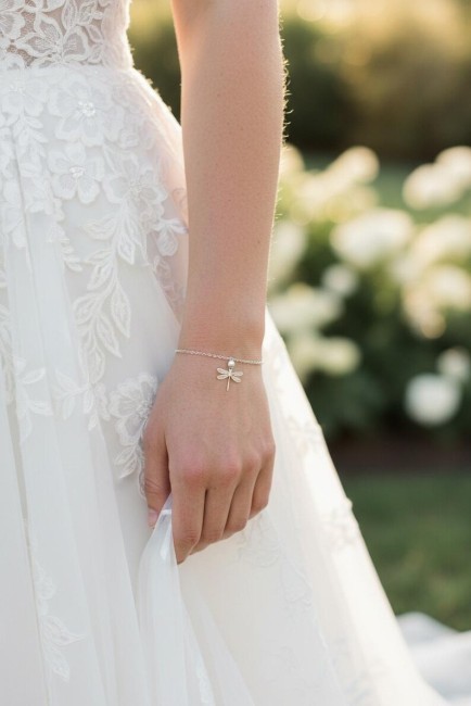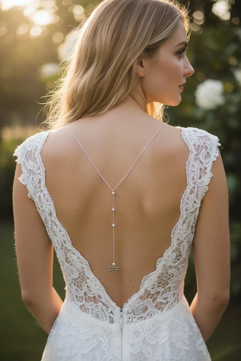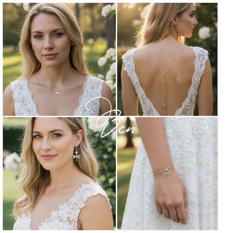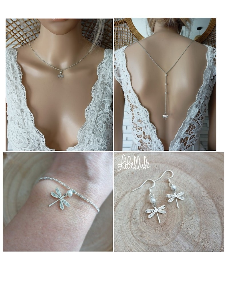 Avec son style nature et romantique cette jolie parure libellule saura vous séduire. Elle sublimera avec élégance un profond décolleté de dos ainsi que votre poignet tout en délicatesse et sans oublier cette jolie petite Paire de boucles d’oreilles associées.
