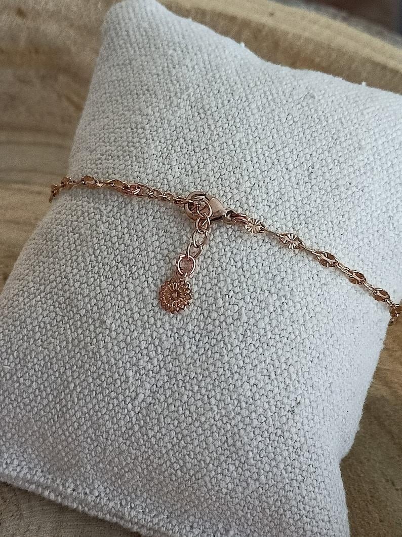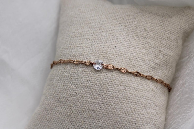 Voici un joli bracelet fin conçu à partir d’une chaîne à maillons ciselées de forme ovale orné d’un petit cristal de swarovski.