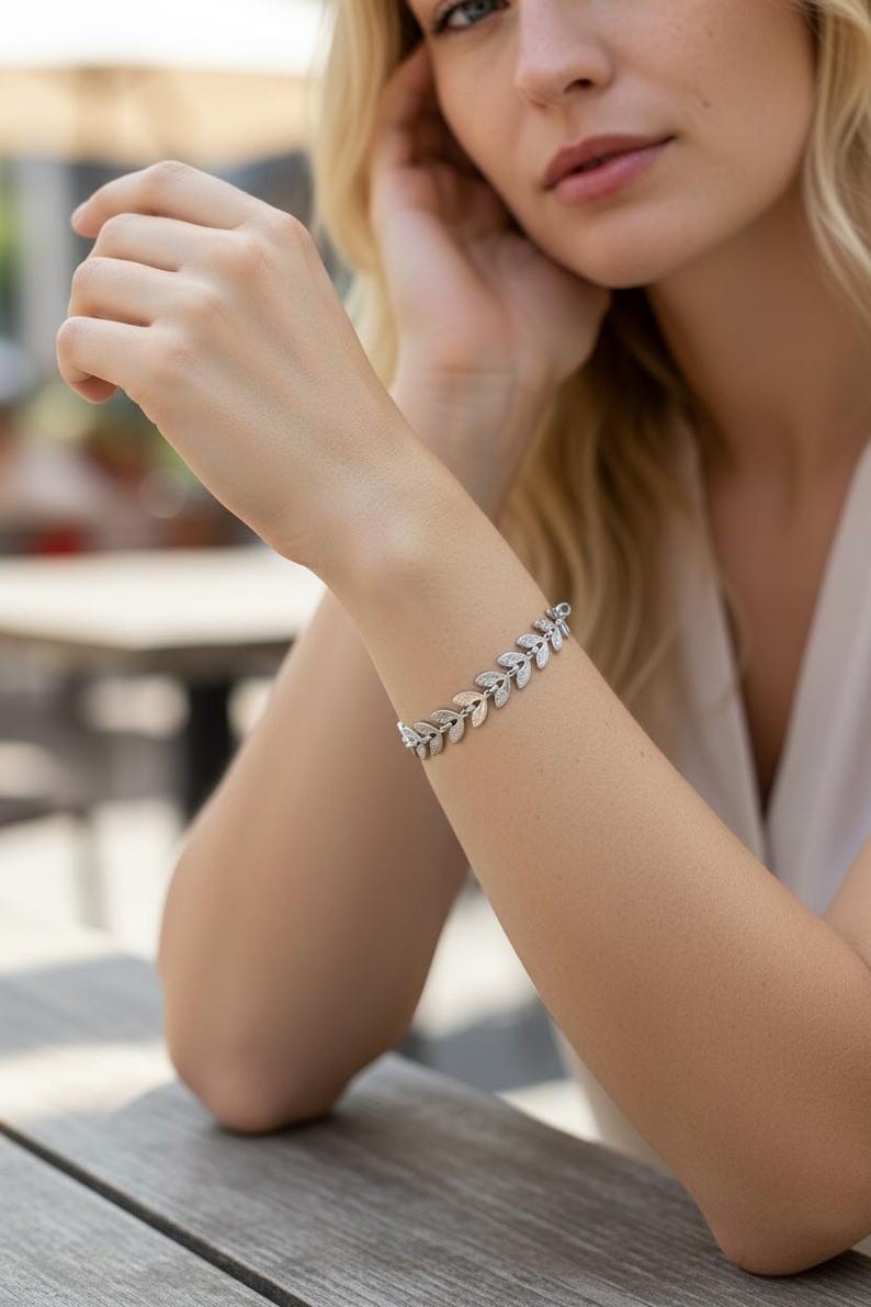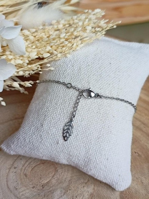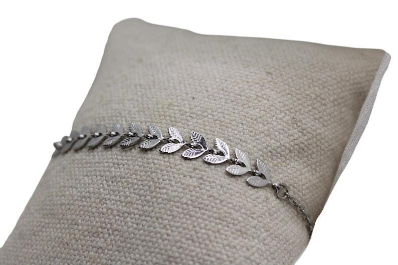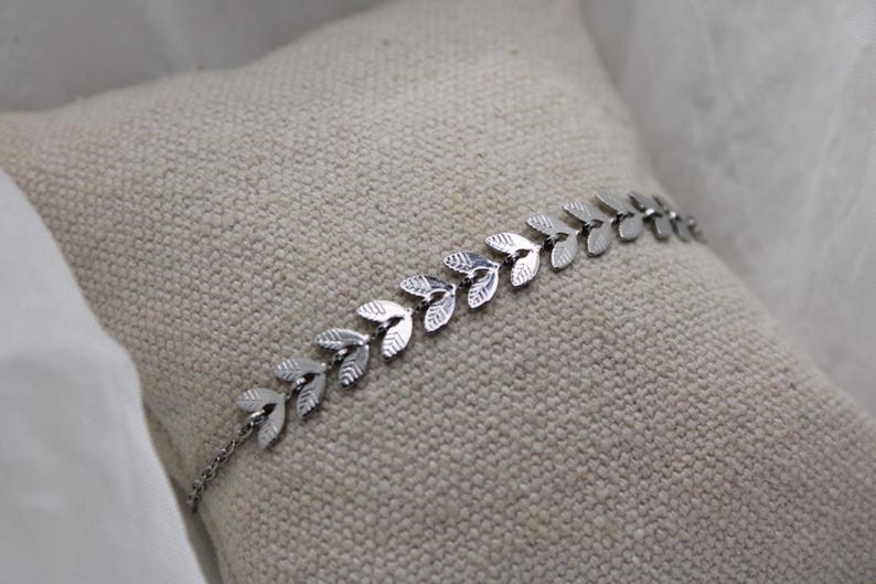 Voici un joli bracelet confectionné d’une fine chaîne argentée tendance agrémentée de plusieurs épis de laurier.