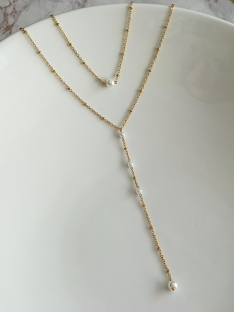 Plein de charme et d'élégance, ce collier de dos possède un design minimaliste dans l'air du temps . Son style épuré avec ses délicates perles feront de ce bijou l'un de vos accessoires favoris . Cette fine chaine satellite perlées en acier inoxydable or ornée d'une subtile perle nacrée sur le devant du collier et d une jolie cascade de dos agrémentée de perles nacrées blanches . Dans la même collection je vous propose aussi les boucles d'oreilles et bracelet associés.