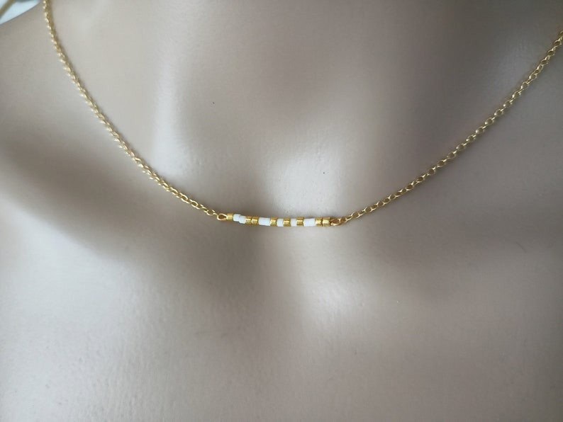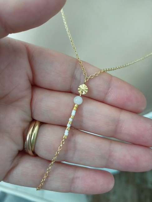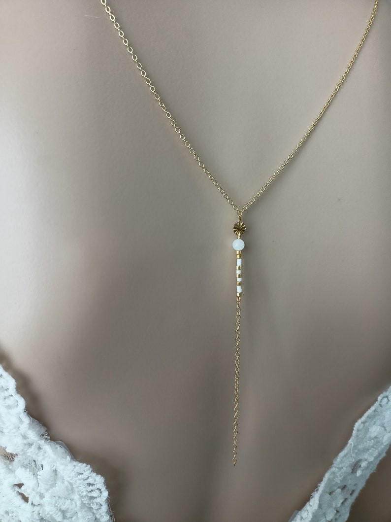 Ce collier de dos a été pensé et créé à partir d'une fine chaine classique dorée en acier inoxydable, agrémentée de plusieurs minuscules et délicates perles de miyuki dans des tons or et blanc orné d’une petite pierre naturelle de 4 mm " Pierre de lune" et d’un petit pendentif ciselé doré en acier inoxydable.