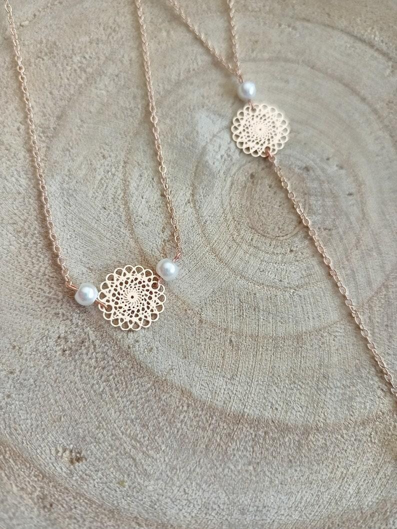 Cette parure, au design minimaliste et raffiné, saura vous charmer. Elle mettra en valeur avec grâce un décolleté de dos tout en soulignant délicatement votre poignet, sans oublier la ravissante paire de boucles d’oreilles assorties. Conçue avec une fine chaîne classique en acier, elle est embellie de perles de verre nacrées blanches et de filigranes mandalas en acier inoxydable doré rose.