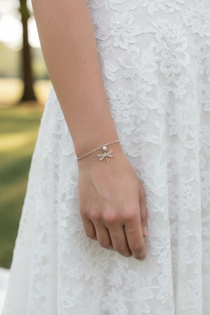 Bracelet de mariée libellule - bracelet fine chaine en acier argent - bijou de poignet libellule orné de perles nacrées - bracelet insecte esprit nature, champêtre